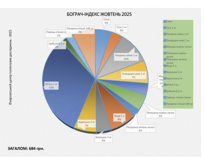Відповідно до «індексу бограча» якщо за вересень 2025 року на родину з п’яти людей потрібно було витратити 670 гривень, то у вересні 2025 року різниця цін склала 14 гривень – і загальна вартість продукції за «Бограч-index» – 684 грн., тобто зміна цін відбулася на 2,1 %