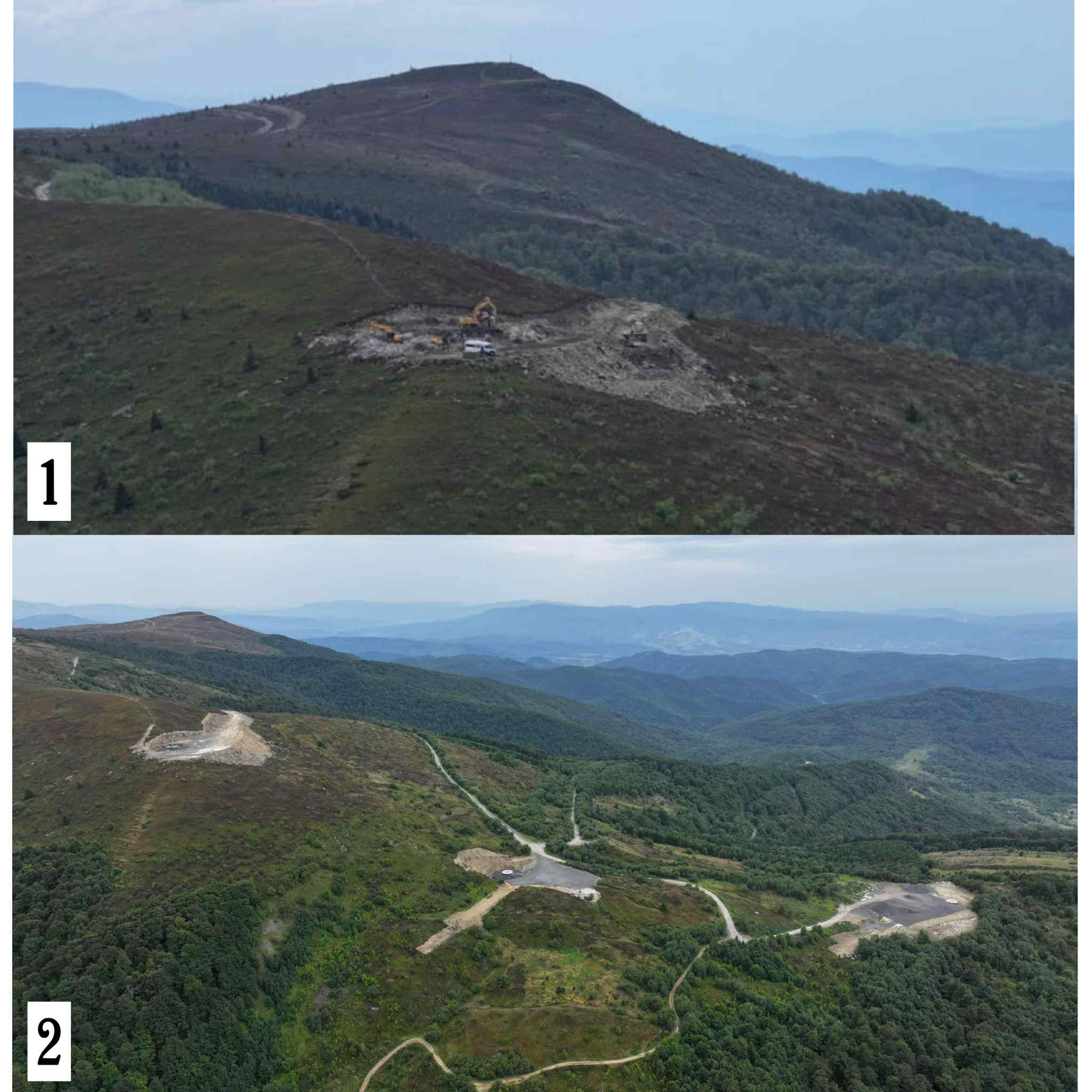 Будівництво ВЕС на полонині Рівній без екологічного висновку: 1) «зрізання» схилу однієї з вершин полонинського плато під монтувальний майданчик ВЕУ; 2) Три з 30 бетонних основ та монтувальних майданчиків ВЕУ та мережа нових доріг на полонині (фото з Інтернету).