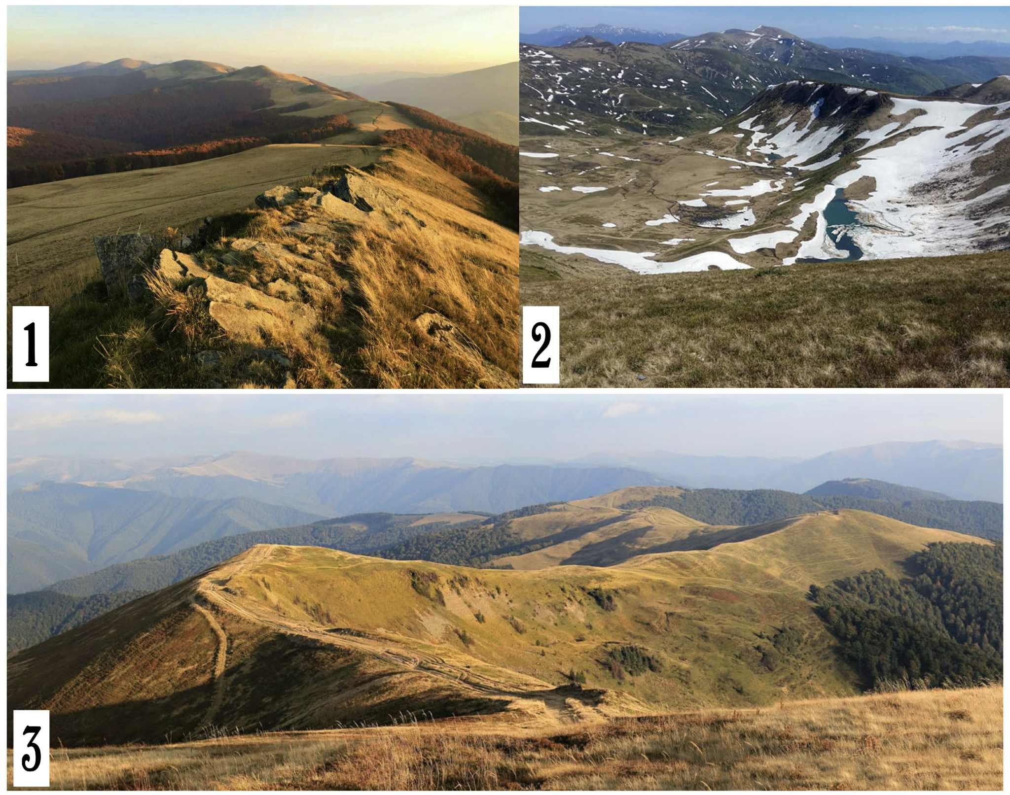 Високогірні хребти Українських Карпат, де заплановано збудувати ВЕС: 1) Верховинський Вододільний хребет (фото І. Меліка); 2) гірський масив Свидовець (фото. Т. Троянь); 3) полонина Красна (фото І. Меліка).