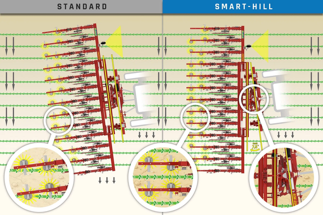 Під час роботи на схилі навіть незначне відхилення трактора призводить до того, що лапи культиватора зсуваються зі смуги, а камери не можуть самостійно це виправити. Smart-Hill аналізує кут нахилу і автоматично вирівнює положення знаряддя, утримуючи його паралельно до рядків культури.