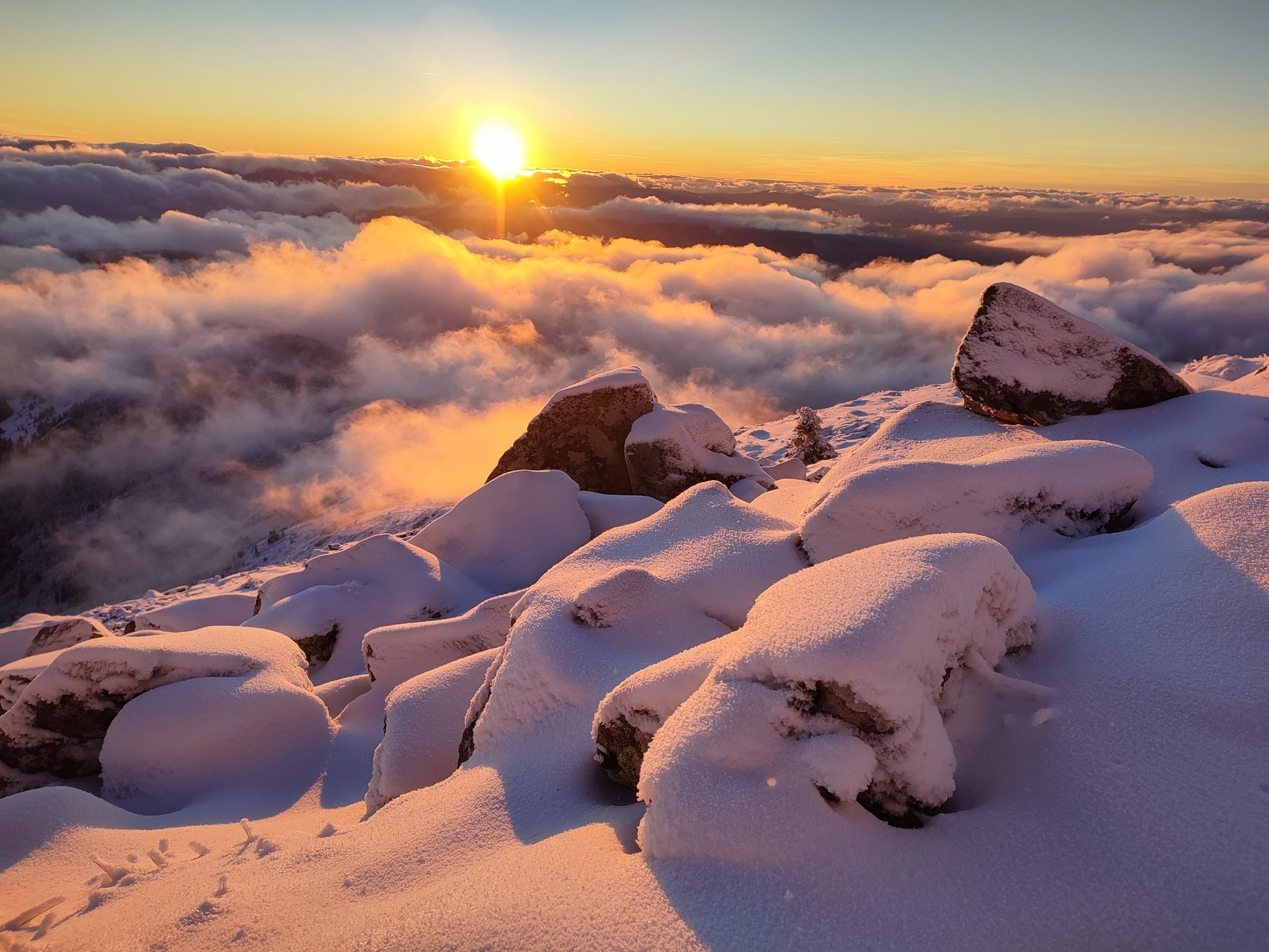 На фото — засніжені схили, хмари під вершинами та яскраве сонце, що заходить за гірський горизонт.