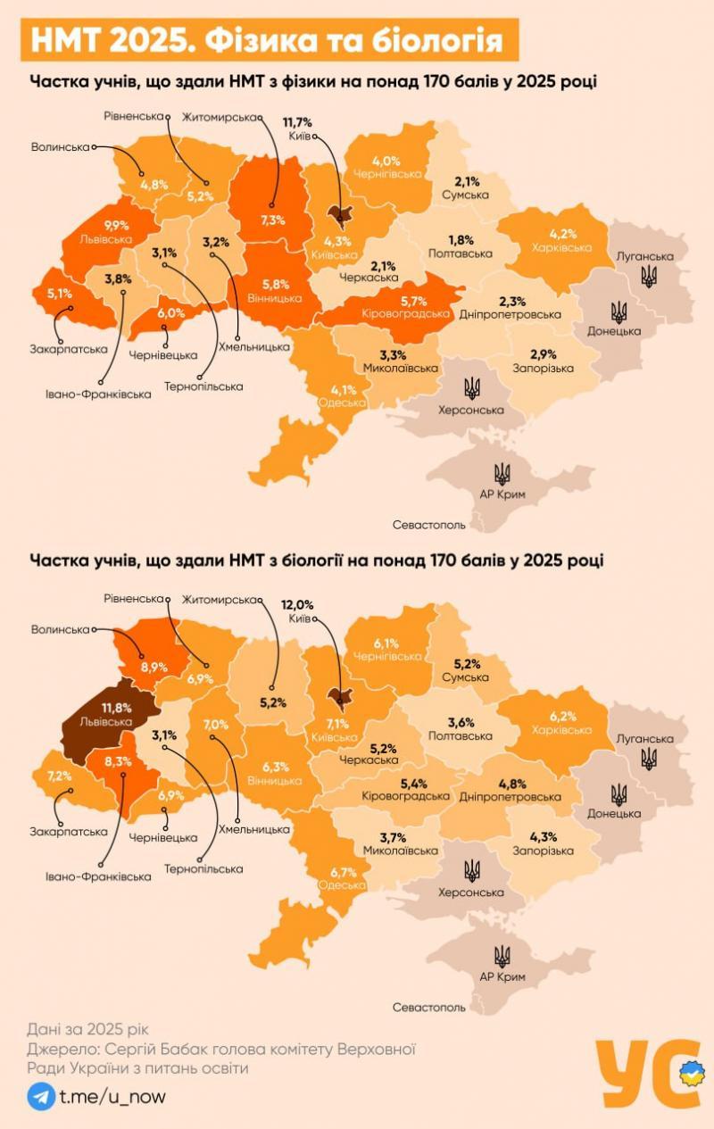 Загалом найвищі результати за рівнем складання НМТ-2025 продемонстрували м. Київ та Львівська область.