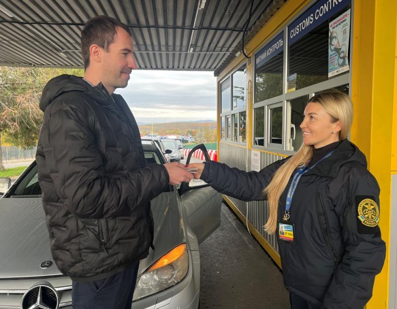 старша державна інспекторка Грета Яцко та державний інспектор Роман Біланич – під час здійснення митного контролю на м/п «Ужгород-автомобільний», що на кордоні зі Словаччиною;