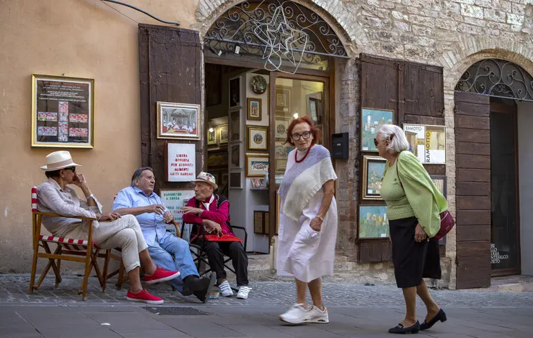 Пожилые итальянские мужчины и женщины разговаривают возле художественной галереи в древнем городе Спелло, регион Умбрия, Италия / 17 сентября 2025 года © Getty Images Местные говорят, что работа, правильное питание и активная социальная жизнь являются ключом к их долголетию.