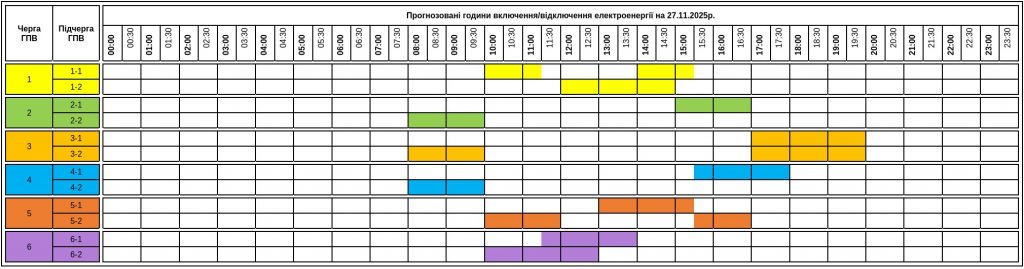 ПрАТ «Закарпаттяобленерго» інформує споживачів про необхідність застосування графіка погодинних включень/відключень електроенергії на четвер, 27 листопада 2025 року.