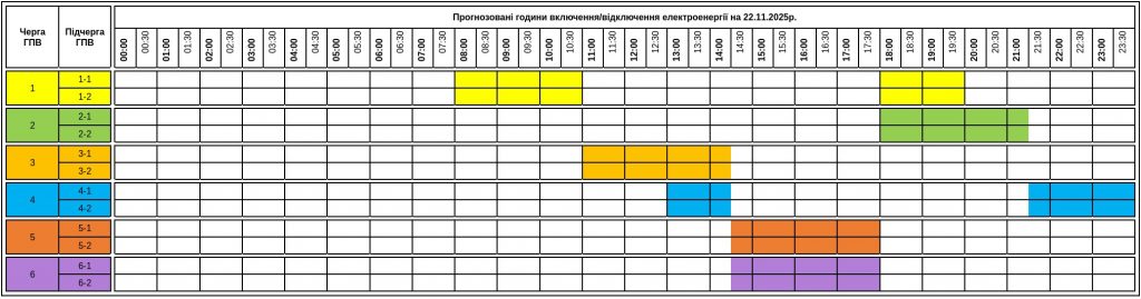 ПрАТ «Закарпаттяобленерго» інформує споживачів про необхідність застосування графіків погодинних включень/відключень електроенергії на суботу, 22 листопада 2025 року.