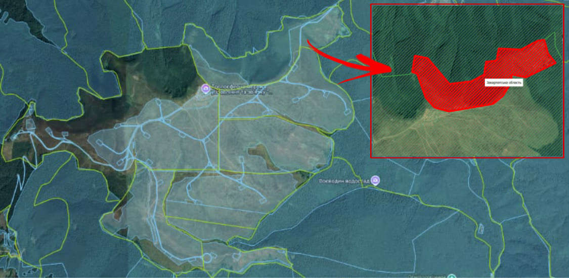 Колаж з мап, що показує землю на полонині Рівна, що фігурує у рішенні сільради і у контексті повідомлення планованої діяльності ТОВ «Вест-Інвес Енерджі»