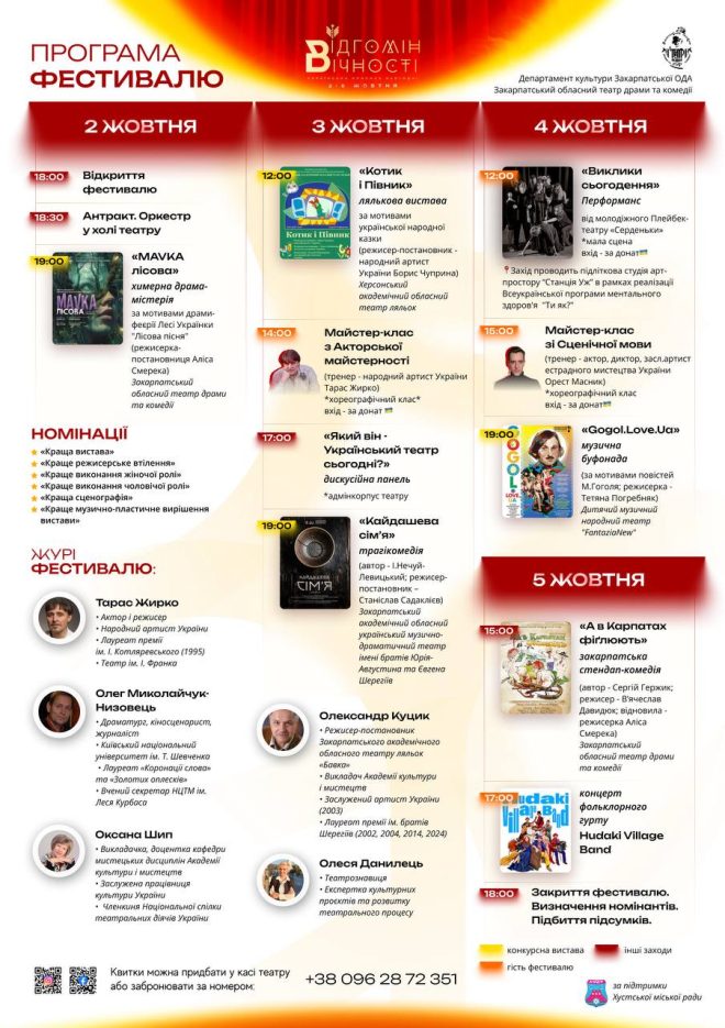 З 2 по 5 жовтня в Хусті триває ІІ Відкритий фестиваль-конкурс осучасненої української класичної драматургії «Відгомін вічності: українська класика сьогодні», організований Закарпатським обласним театром драми та комедії.