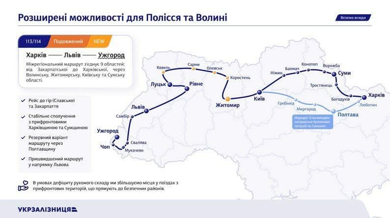 Цей соціально важливий поїзд, який раніше був безальтернативним для мешканців Полісся та Волині, тепер відкриває для них нові можливості. Рейс дає змогу жителям Житомира, Олевська, Сарн, Рафалівки та інших міст на маршруті не лише підтримувати надійне сполучення з Сумщиною та Харківщиною, але й зручно подорожувати до карпатських гір (Славсько) та Закарпаття (Ужгород).